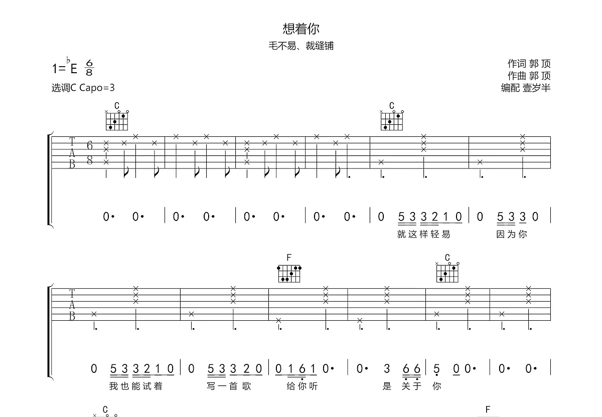 想着你吉他谱_毛不易,裁缝铺_c调弹唱吉他谱77%原版 - 吉他世界
