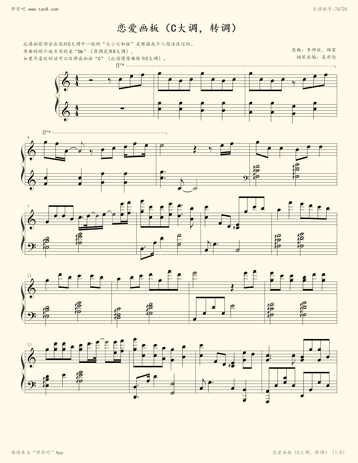 《恋爱画板,钢琴谱》c大调,转调,7级,完整版,李师珏,锦零(五线谱 简谱