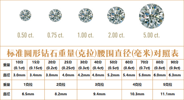 钻石重量(克拉)与尺寸对照表