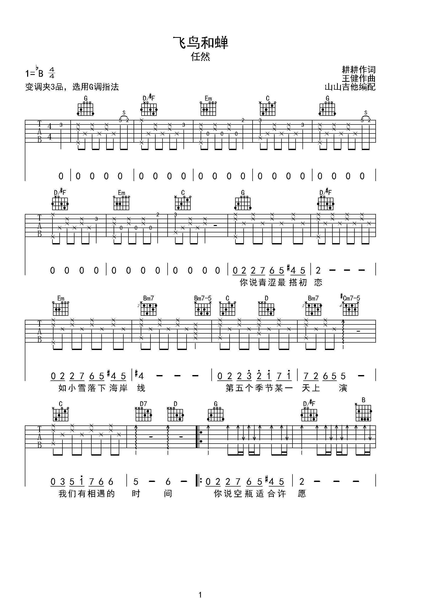 飞鸟和蝉 任然原版吉他谱 山山吉他编配bb调六线吉他谱-虫虫吉他谱