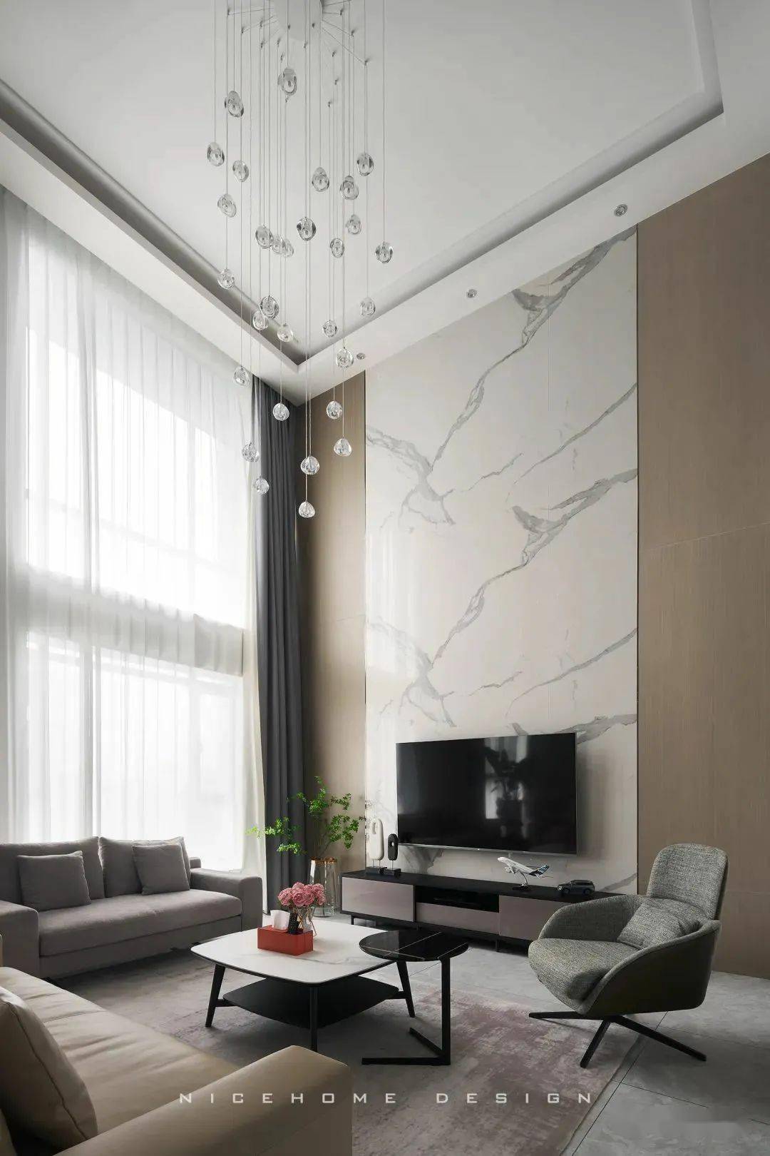 大理石挑高背景墙,中空客厅设计的必要元素