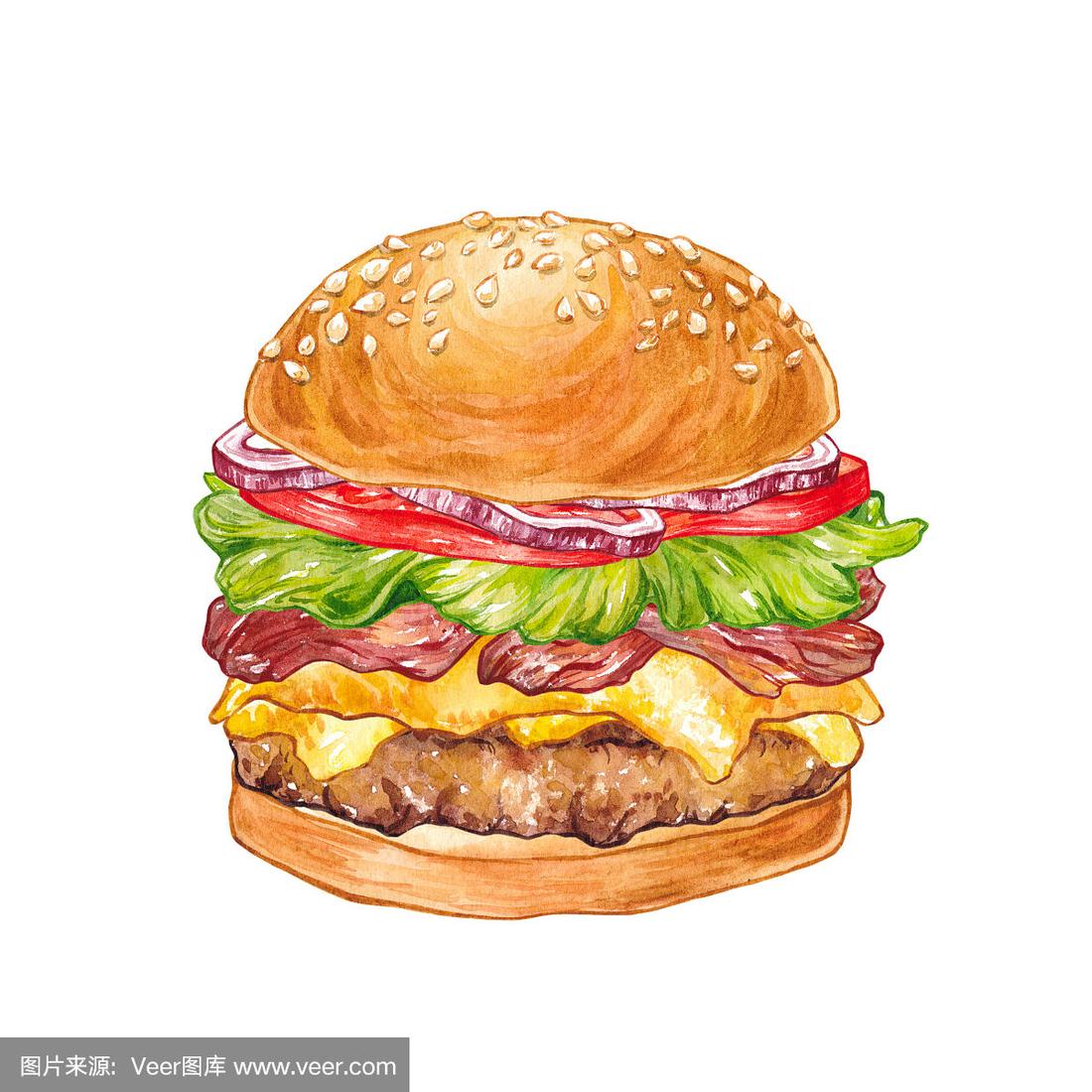双层牛肉芝士汉堡水彩美食写生