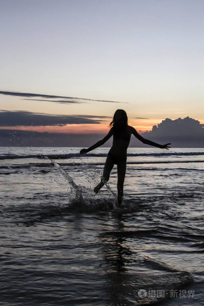 在海滩上夕阳背景下奔跑的女孩剪影照片-正版商用图片18s7ej-摄图新