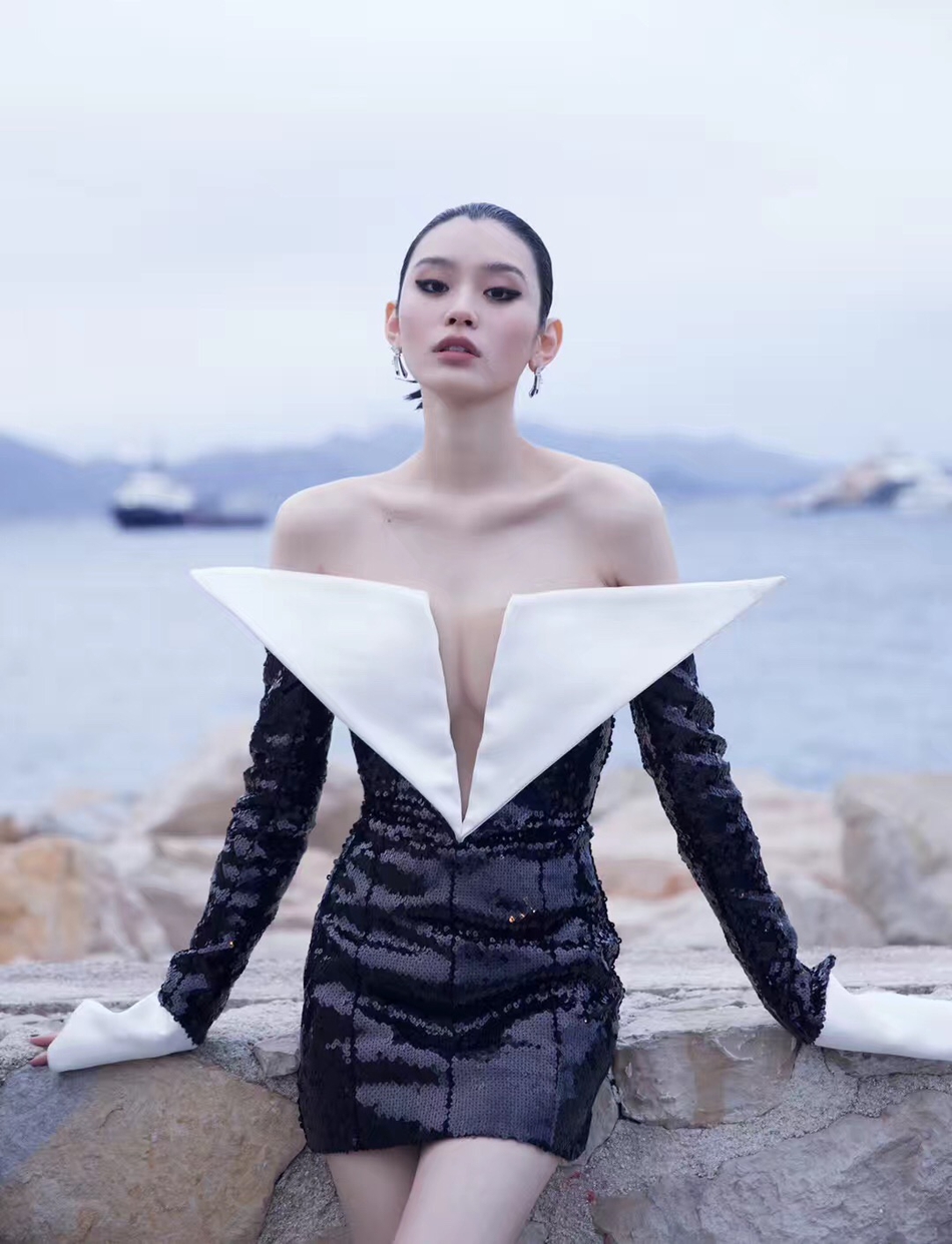 与落地戛纳之时青春洋溢的运动时尚风不同,晚宴当晚,奚梦瑶身穿黑色