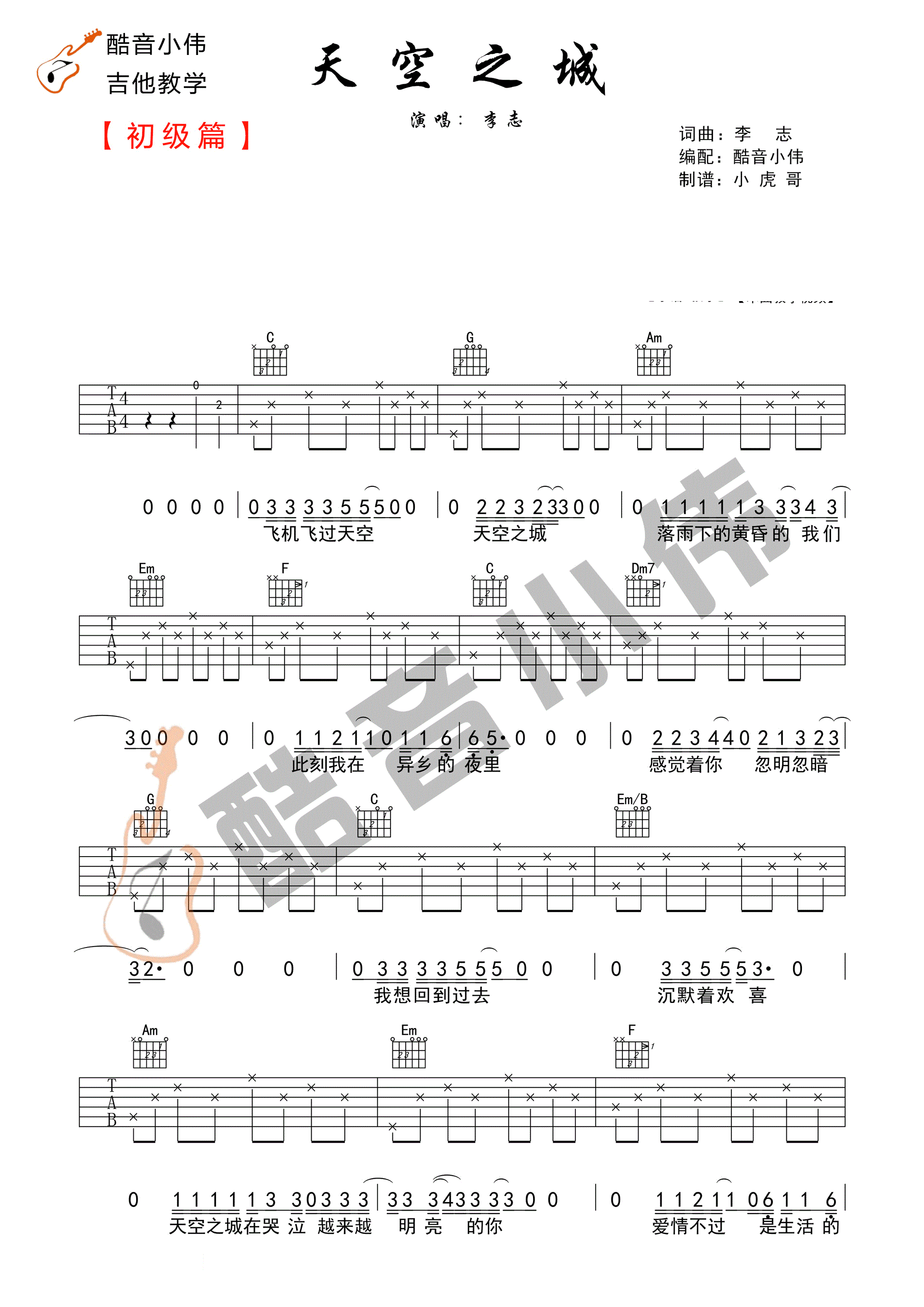 【酷音小伟】《天空之城》李志 初学简单版吉他谱