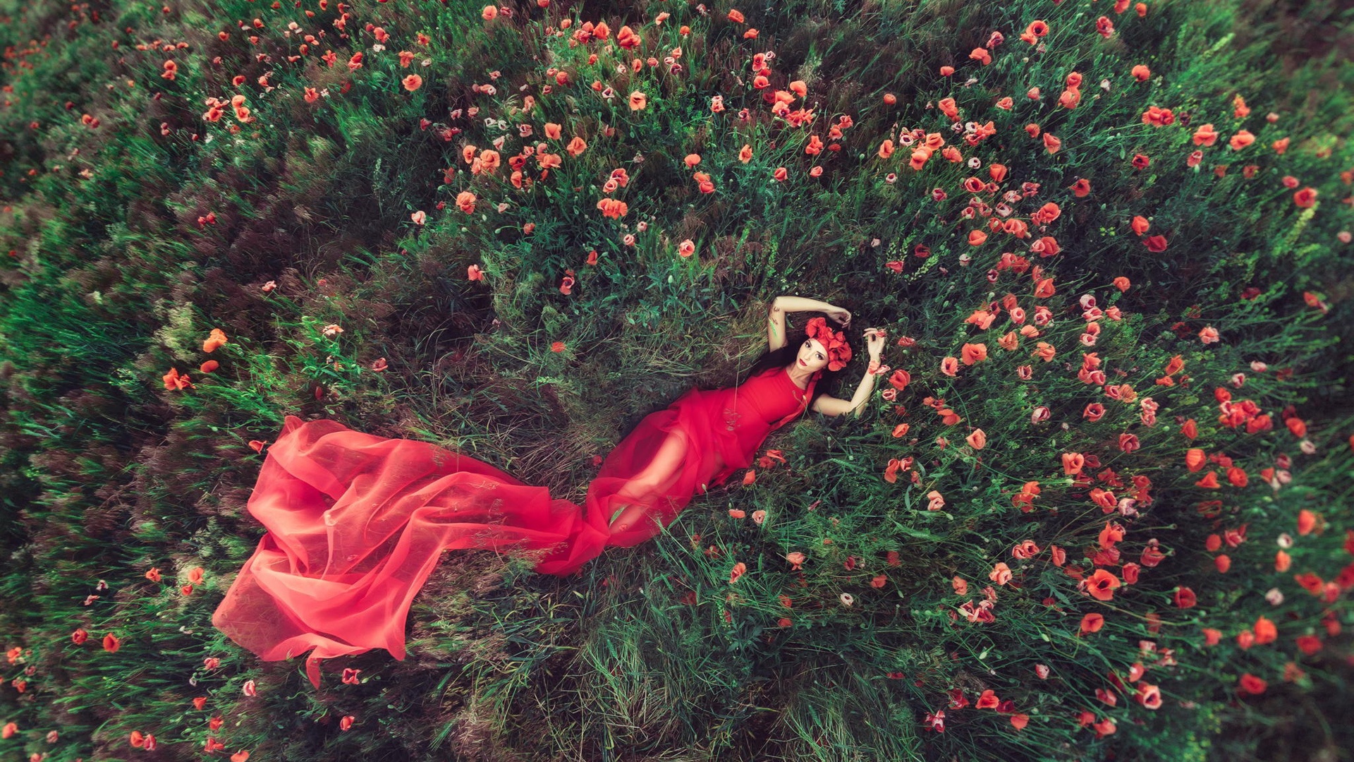 2020-06-16壁纸标签:罂粟花鲜花花海红色裙子礼服花环美女唯美桌面