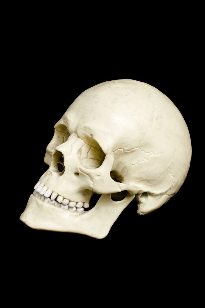 头骨,孤立在黑色背景上的假头骨的侧面图