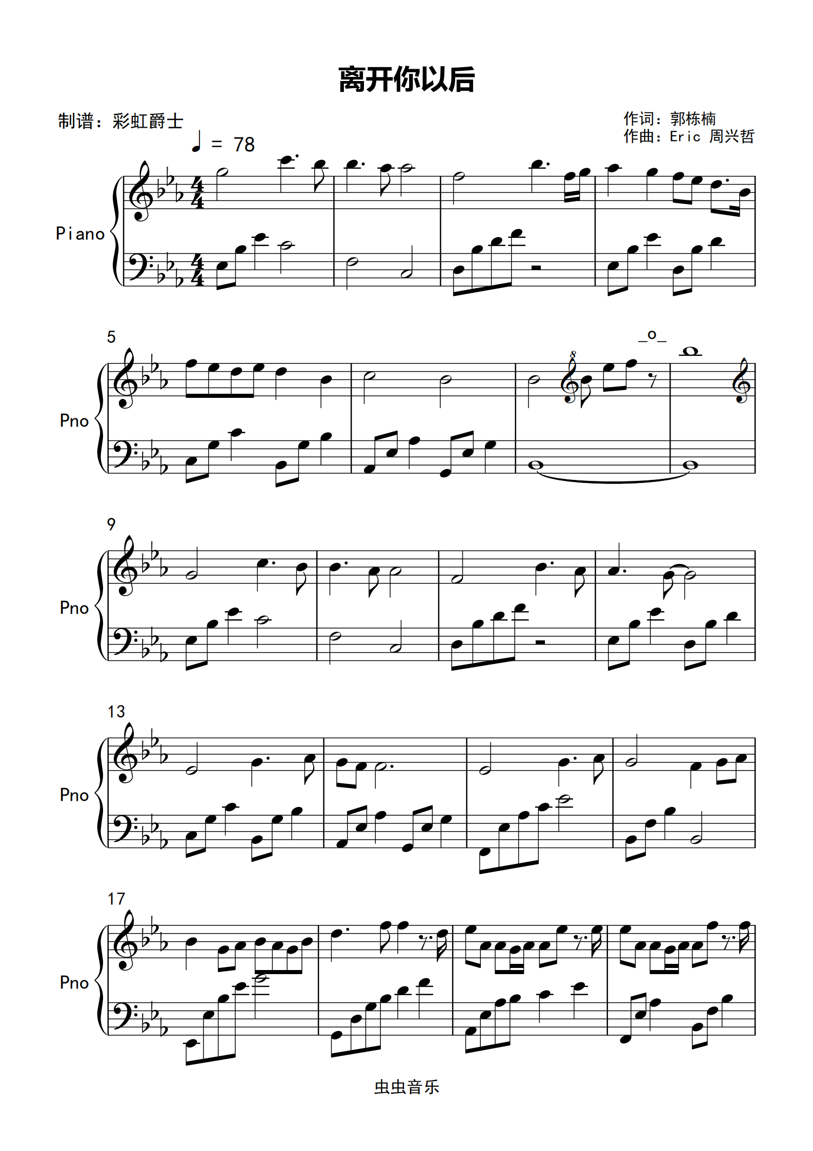 离开你以后钢琴谱周兴哲e调流行钢琴五线谱