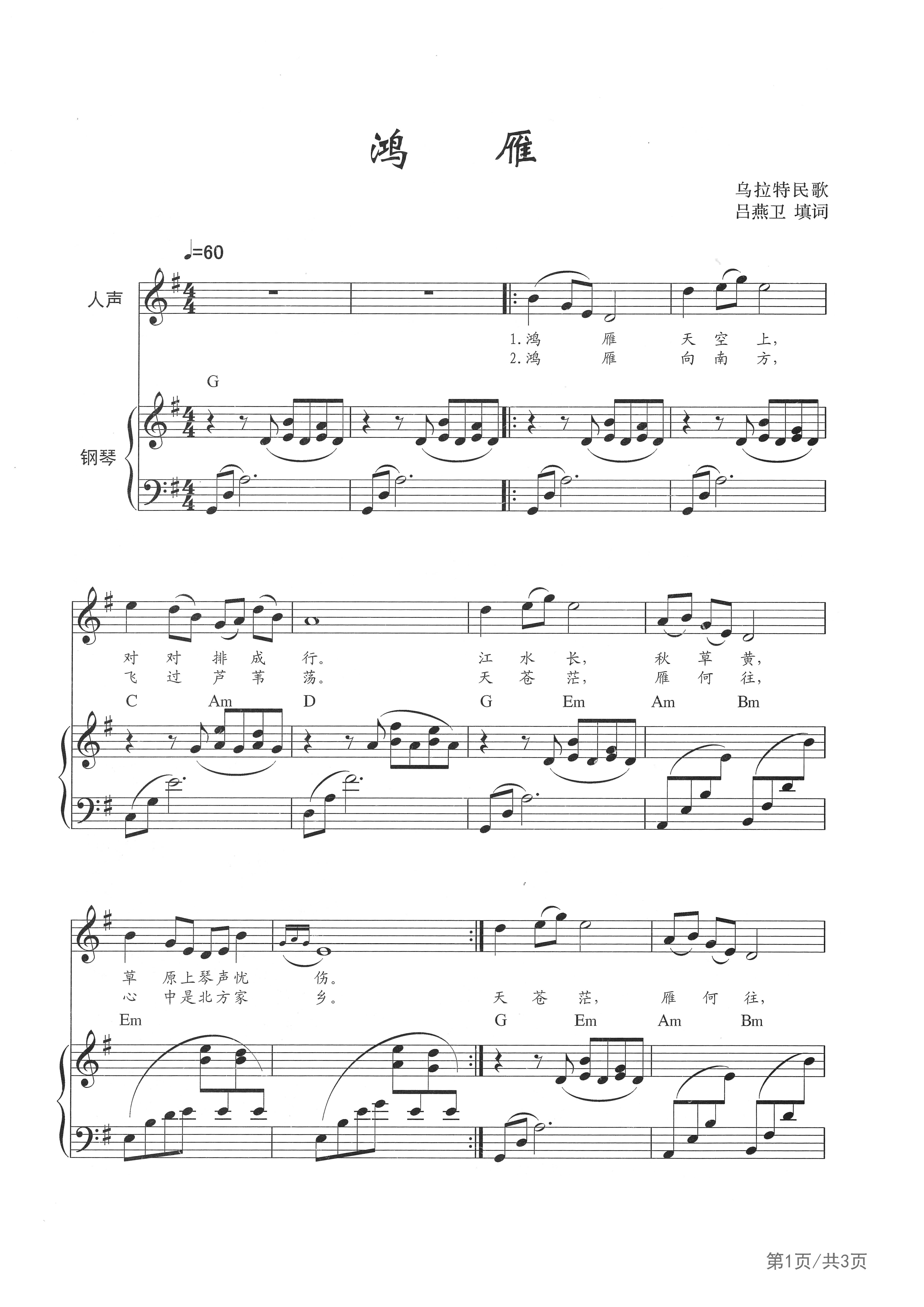 鸿雁呼斯楞g调钢琴弹唱五线谱