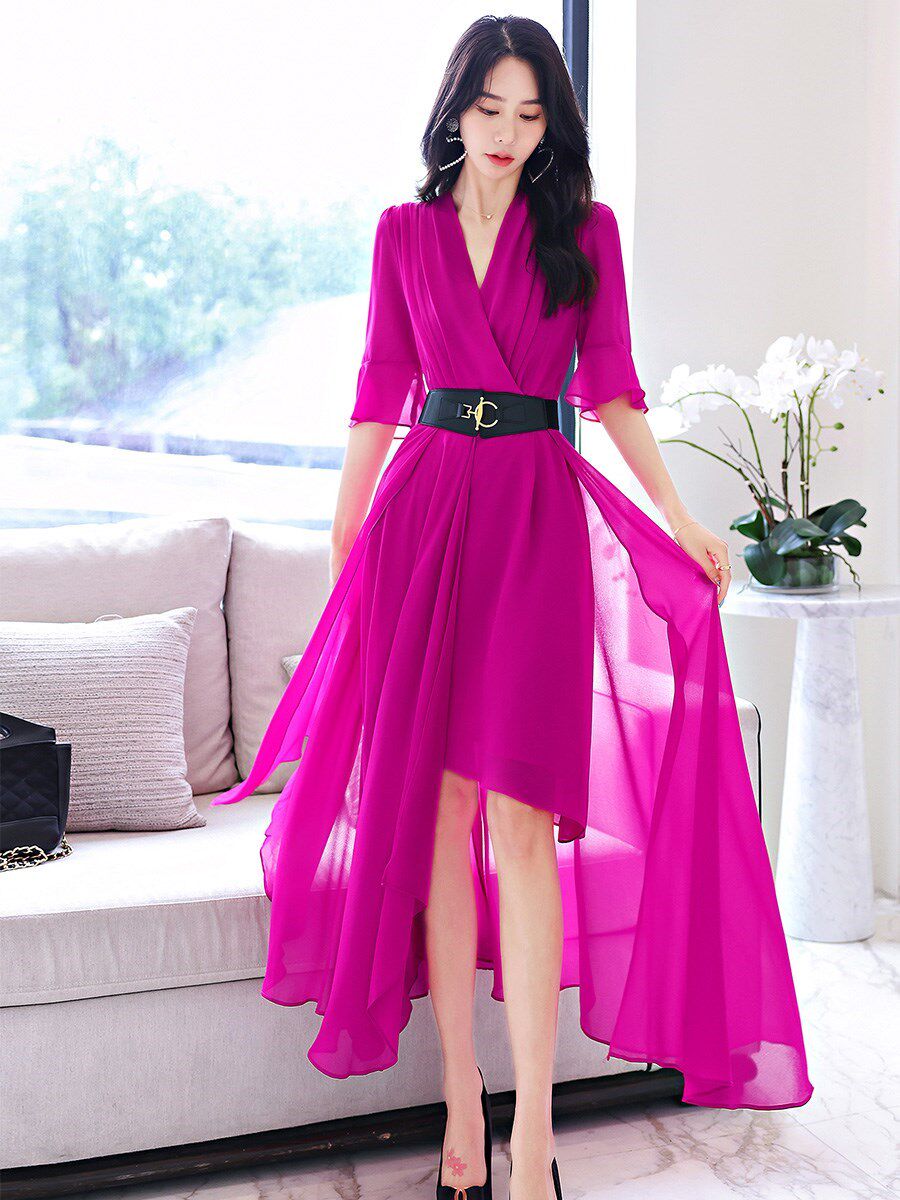 高端气质女装2022春夏新款蕾丝裙中长款收腰显瘦v领名媛连衣裙女