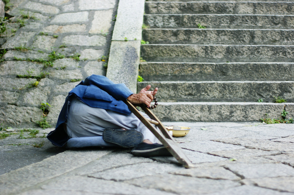 乞者 br /> 厦门,某寺庙台阶下的乞者.他躺地上,睡着,手时而抽搐.