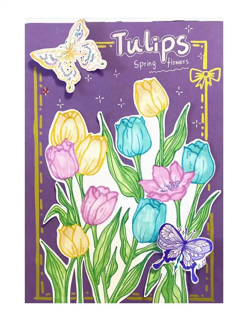 钢笔淡彩春天里的郁金香带线稿