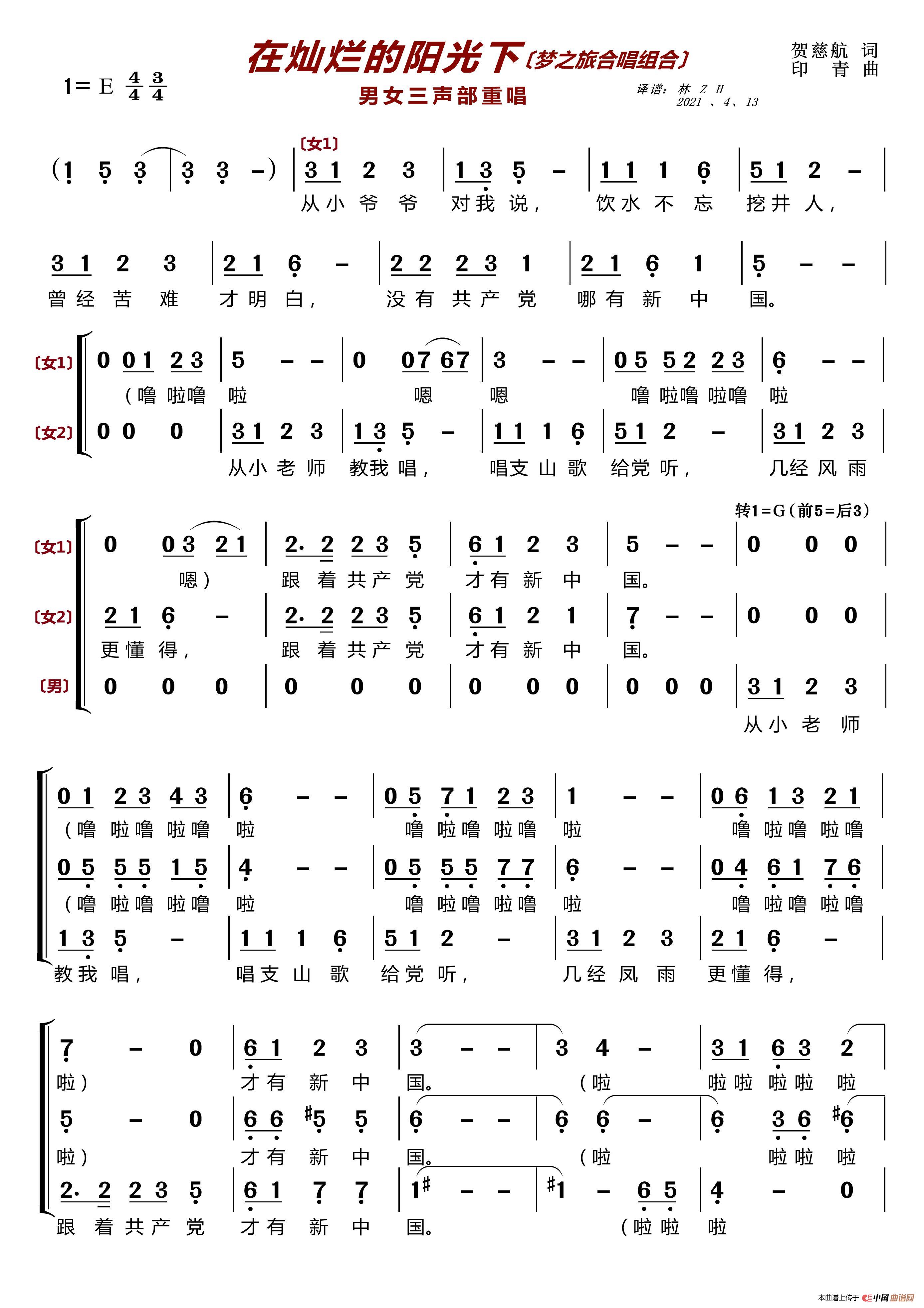在灿烂的阳光下〔梦之旅合唱组合〕(男女三声部重唱)简谱-曲谱 - 酷好
