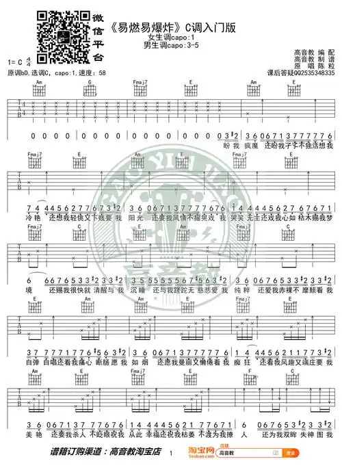 易燃易爆炸(升c调) 吉他谱 - 第1张