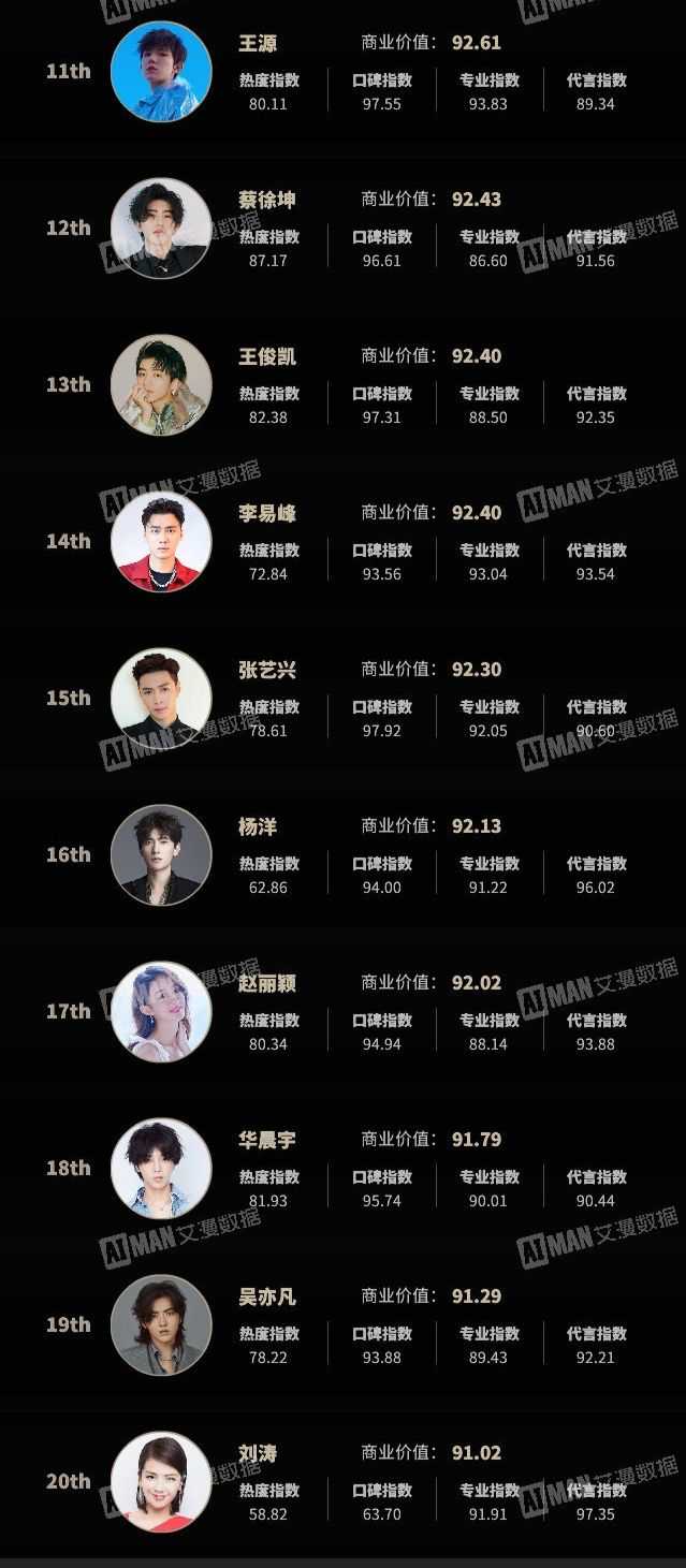 2023年内娱男顶流排名,易烊千玺王一博蔡徐坤肖战谁能笑到最后?