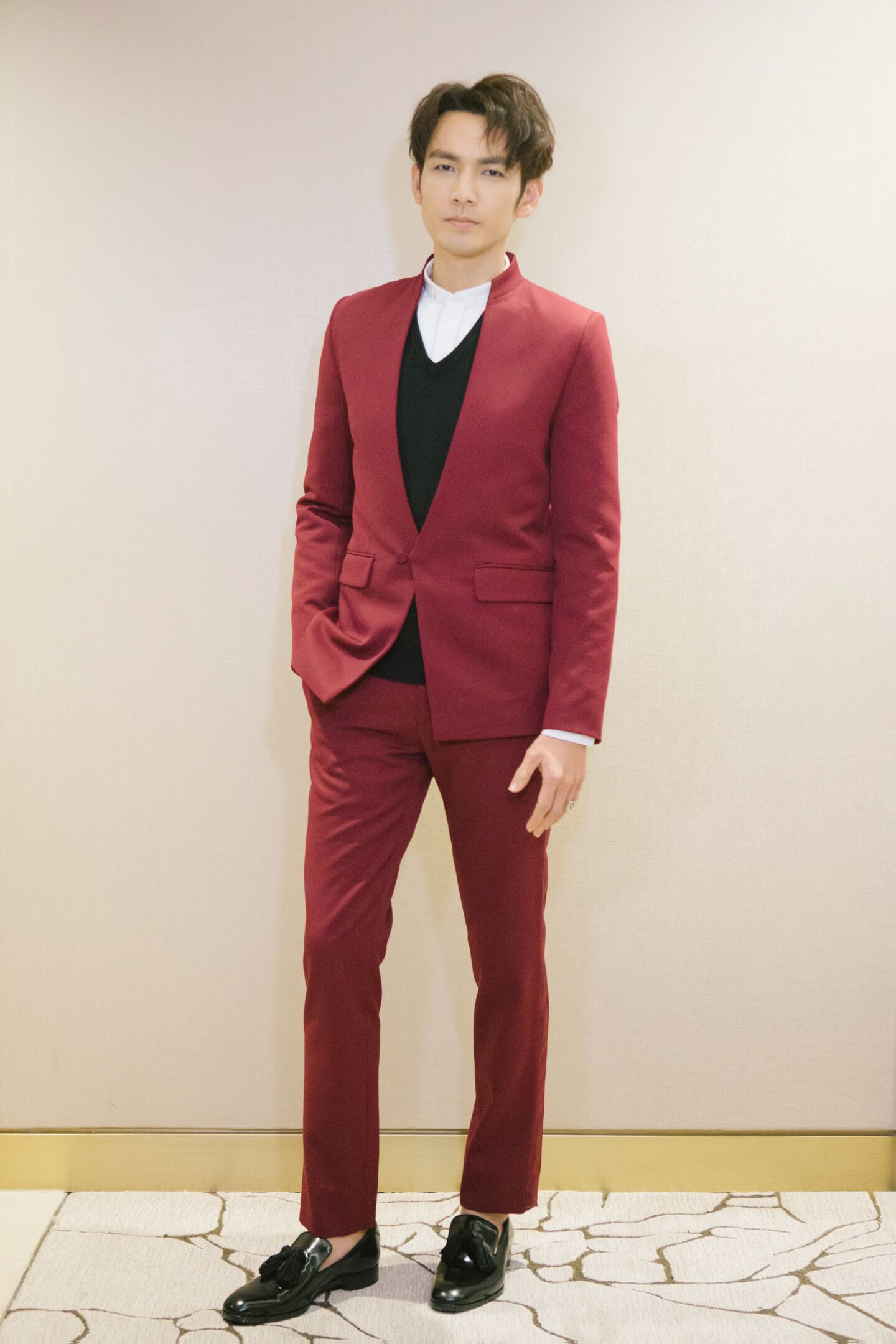 钟汉良穿阿玛尼emporio armani品牌丝绒西装搭配紫色裤子出席活动