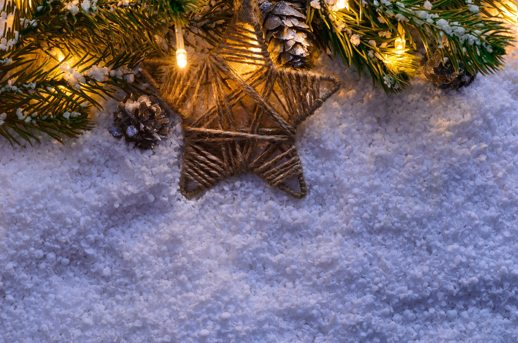 圣诞枞树与灯光和星星在雪地里在黑暗中,从上面查看