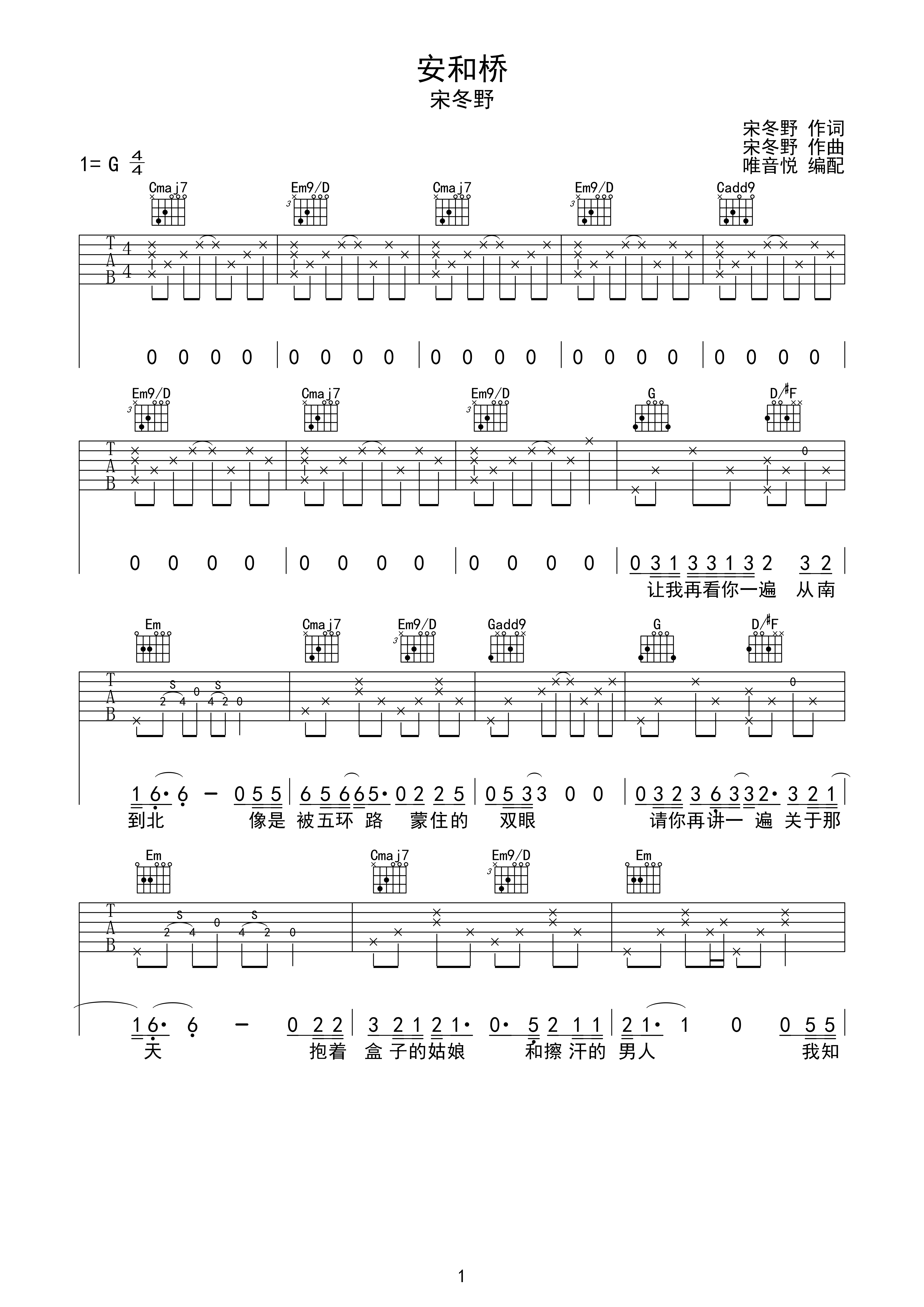 安和桥 宋冬野 原版简单版 唯音悦制谱 完整版间奏g调六线吉他谱-虫虫
