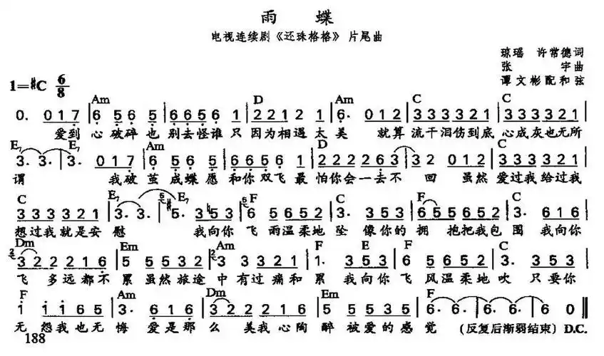 雨蝶歌曲简谱歌词词:许常德/琼瑶曲:张宇编曲:涂惠源爱到心破碎也别去