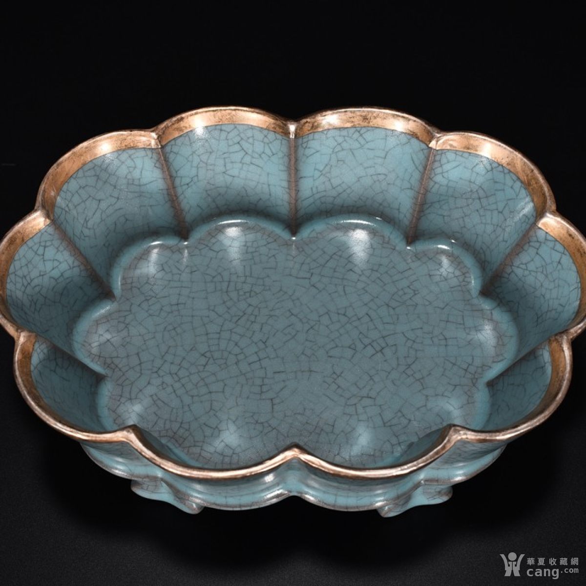 宋汝窑天蓝釉蟹爪纹水仙盆镶银口(乾隆御题铭文)