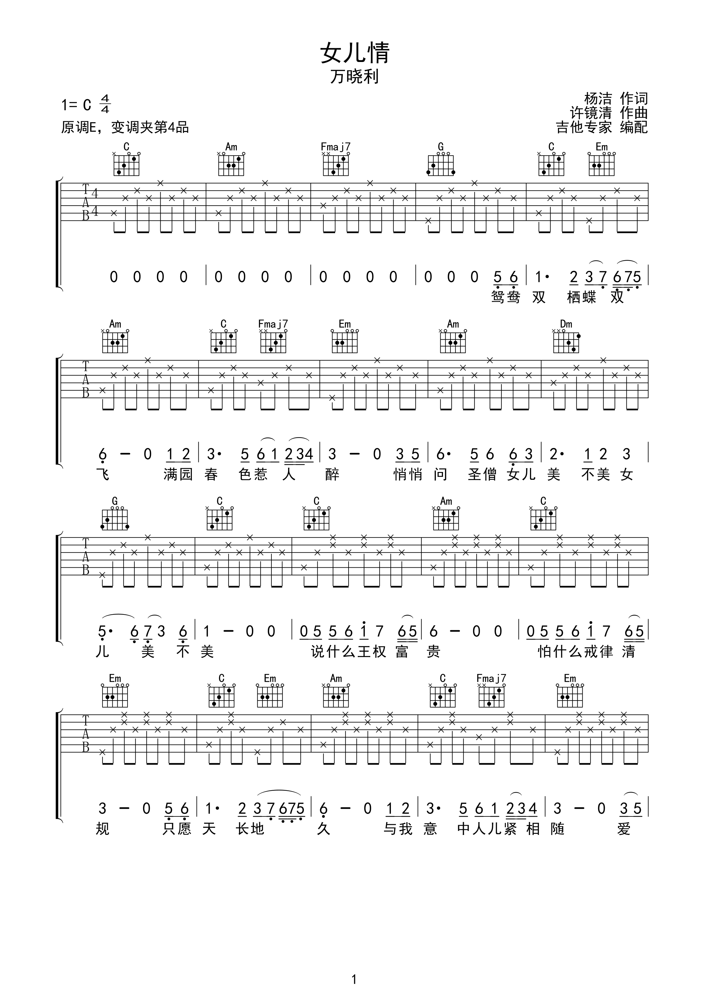 女儿情 简单版入门吉他谱c调六线吉他谱-虫虫吉他谱免费下载