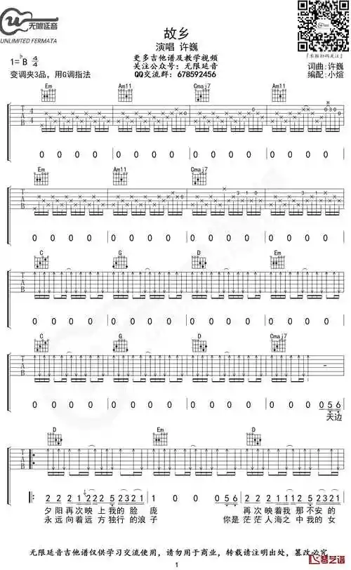 故乡吉他谱 g调指法 许巍 无限延音编配1