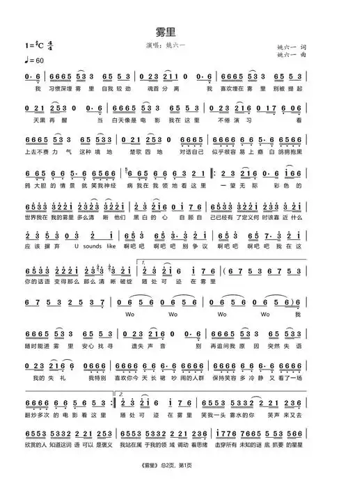雾里简谱完整版 姚六一 雾里歌词 | 搜吉他谱网
