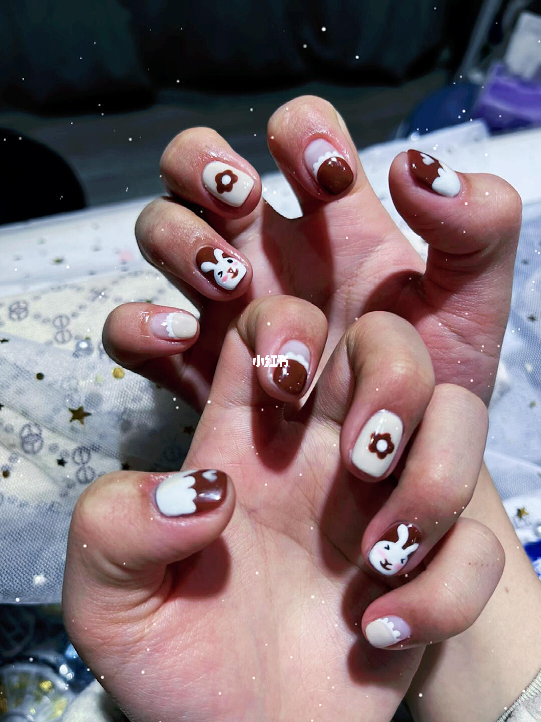 ins风不规则美甲 手绘草莓熊 双层爱心