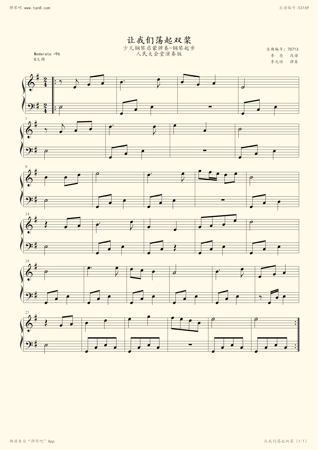 钢琴谱:让我们荡起双桨 — 少儿钢琴启蒙弹奏