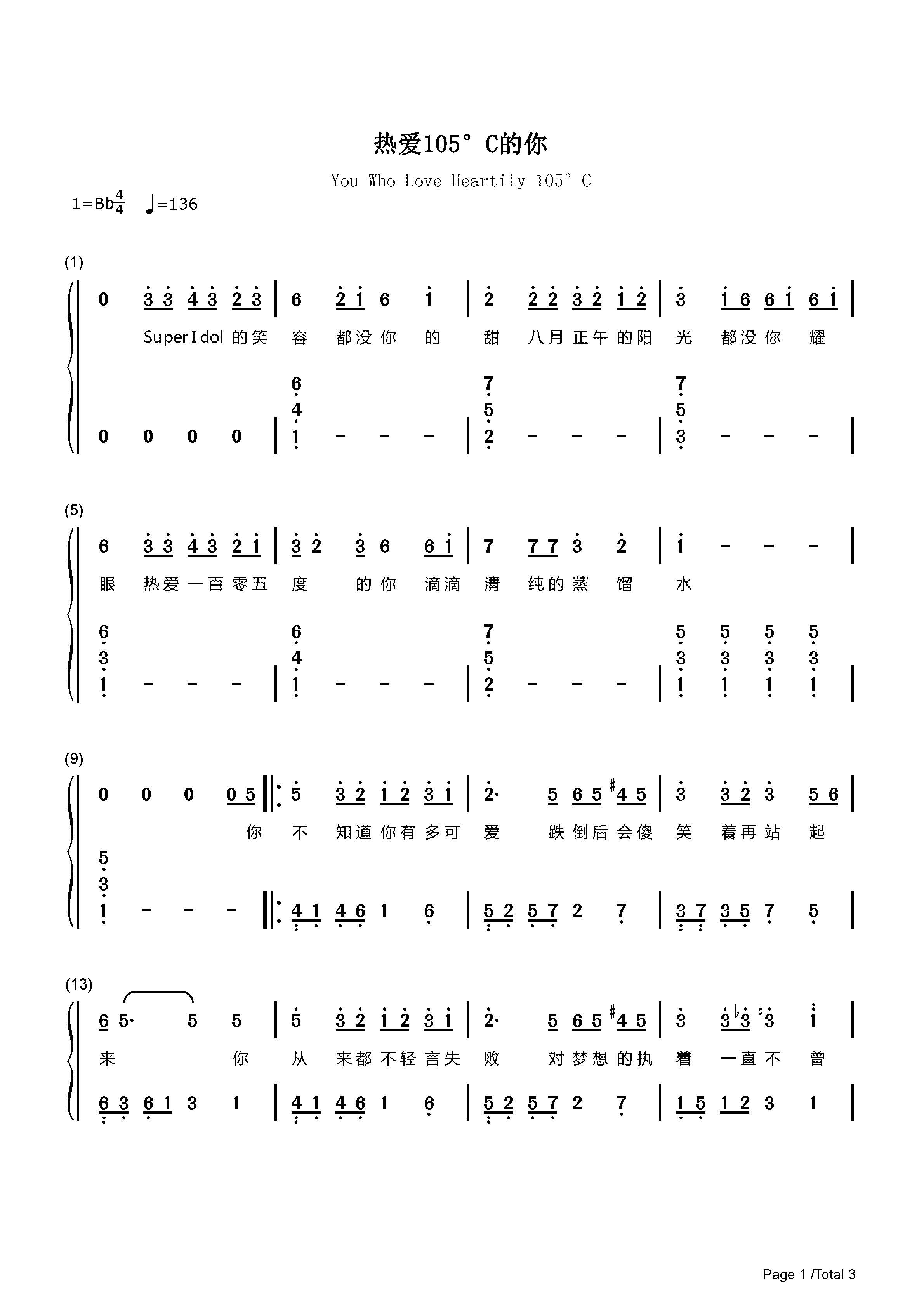 热爱105c的你钢琴谱阿肆降b调流行钢琴简谱