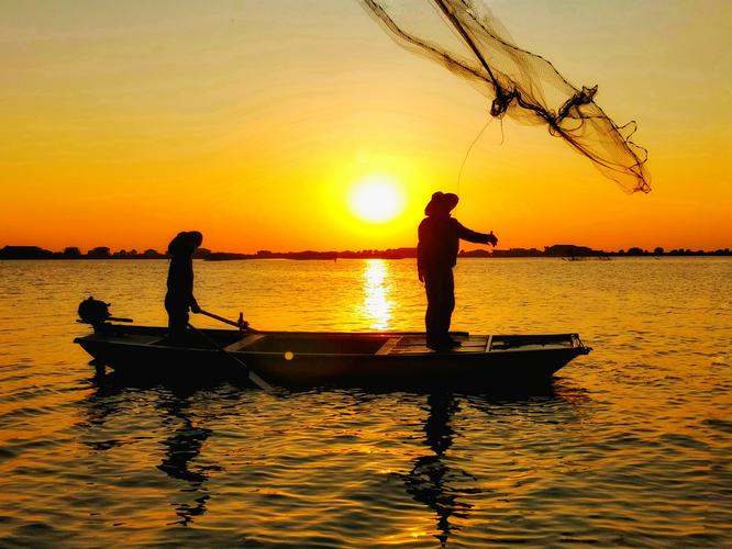 渔夫在夕阳下撒网