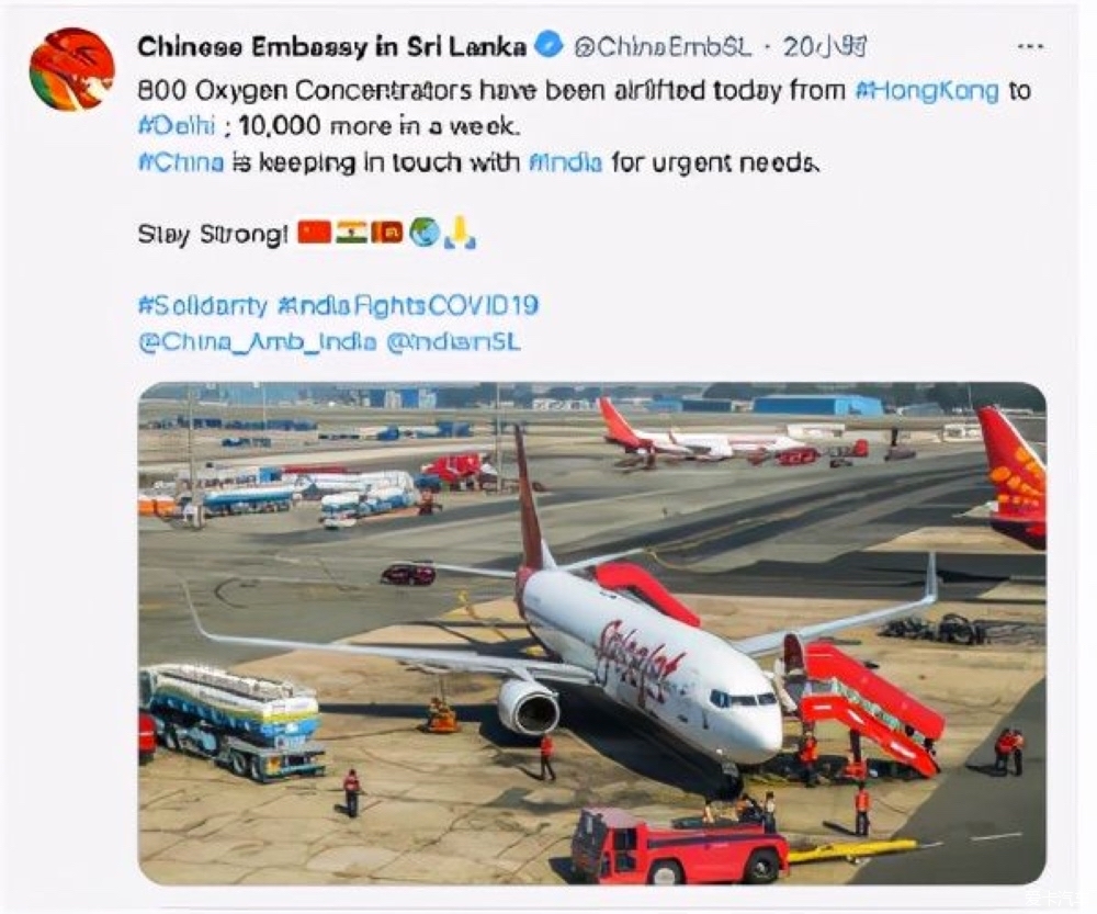 中国使馆发推宣布800台制氧机运抵德里印度网友远亲不如近邻