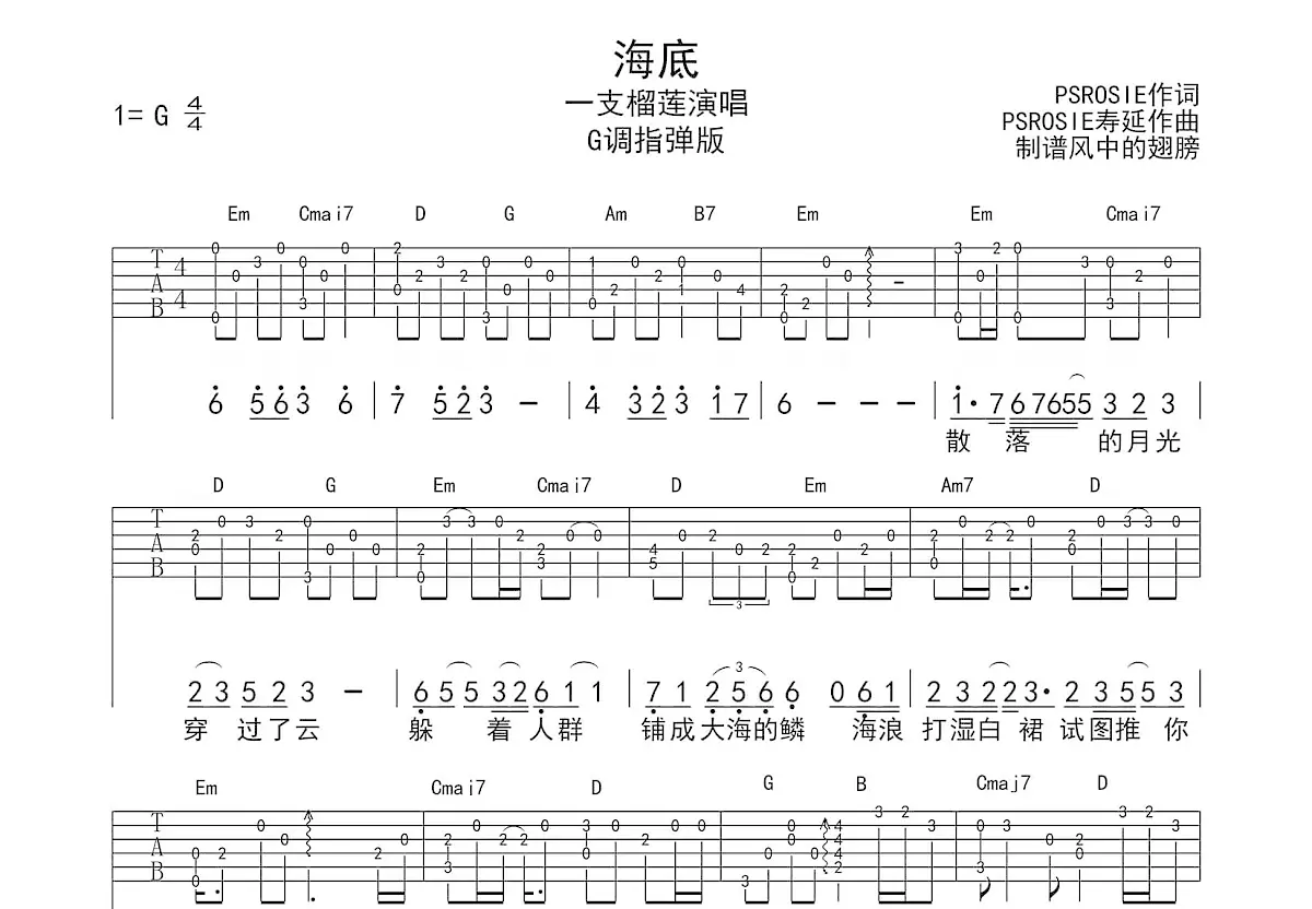海底吉他谱_一支榴莲演唱g调指弹_风中的翅膀up - 吉他世界