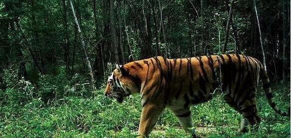 坎哈山路偶遇一头巨虎,体型目测230公斤,真正的野生老虎!
