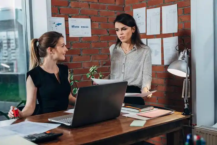 友好的女老板给她的助理女孩写了一张纸条在办公室里讨论任务