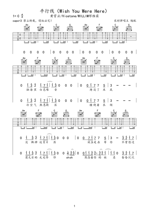 黄霄云平行线wishyouwerehere吉他谱