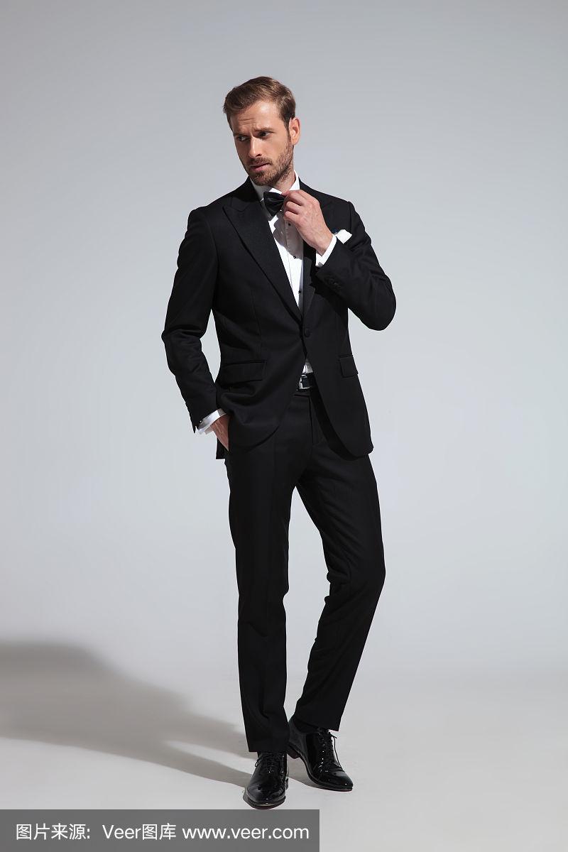 一个傲慢的时髦男人在西装的侧面视图