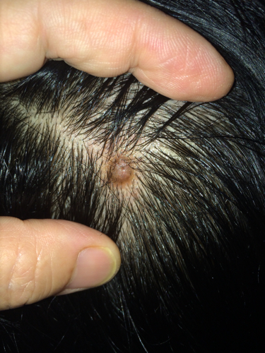 问:头上长了一个肉疙瘩,十五六年了,很大(如下图)