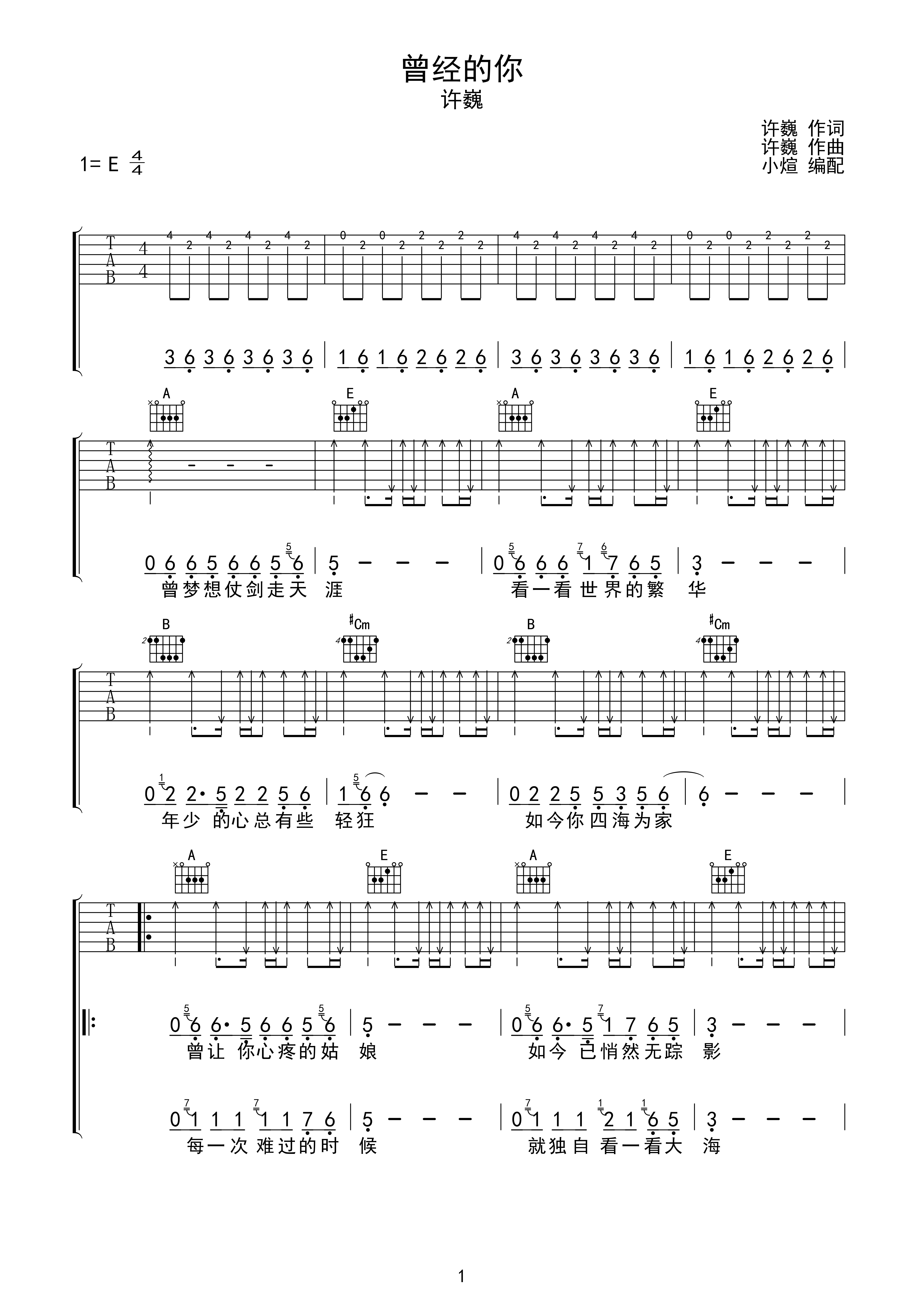 曾经的你吉他谱-弹唱谱-e大调-虫虫吉他