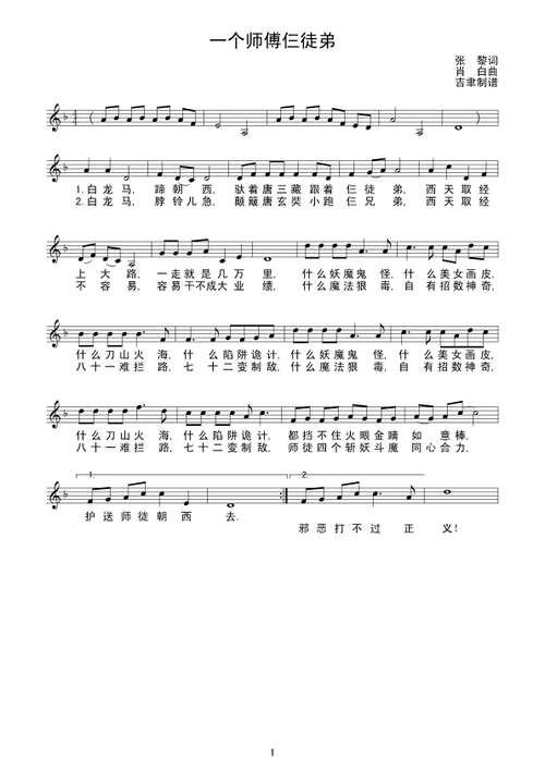 一个师傅仨徒弟 钢琴谱,歌谱 五线谱