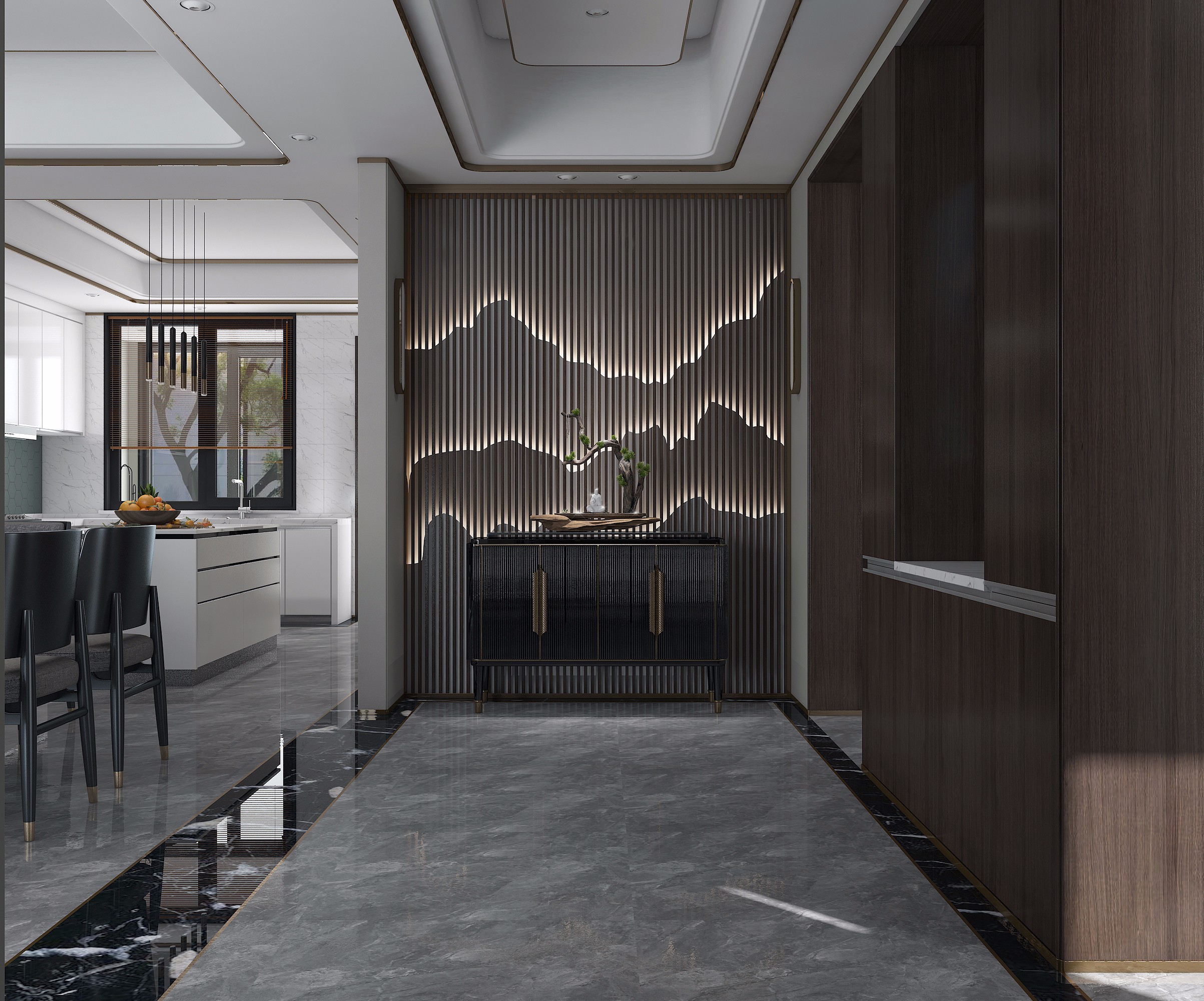 建房图库 北京大兴魏家新中式别墅玄关背景墙采用整块大理石板瓷砖铺