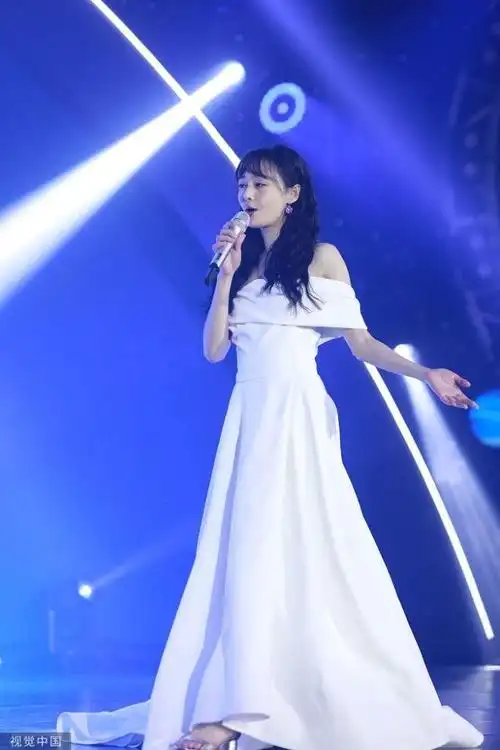 高圆圆蓝单边露肩连衣裙,一双的一字带凉鞋,成熟优雅.