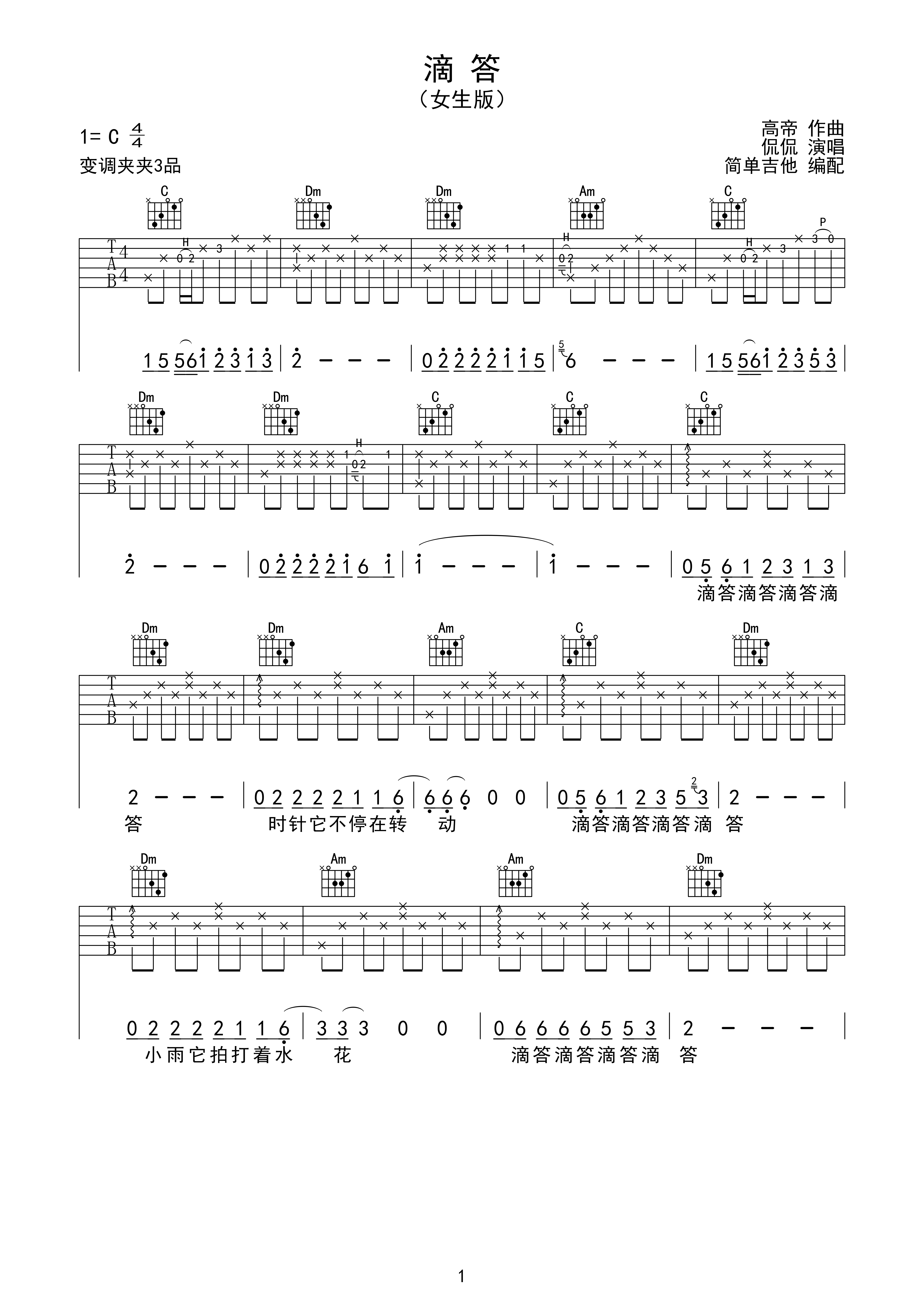滴答c调六线pdf谱吉他谱-虫虫吉他谱免费下载
