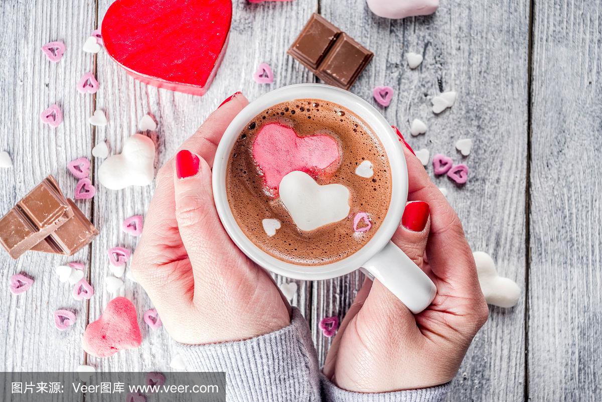 女孩的手握热巧克力与棉花糖心