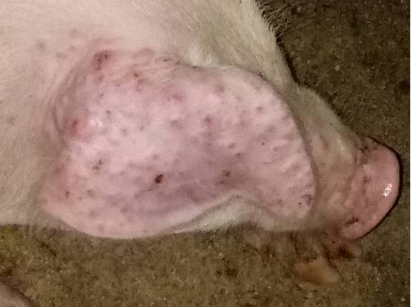 断奶仔猪刚开始有两头小猪耳朵上背部起了几个水泡到现在已经有五六头