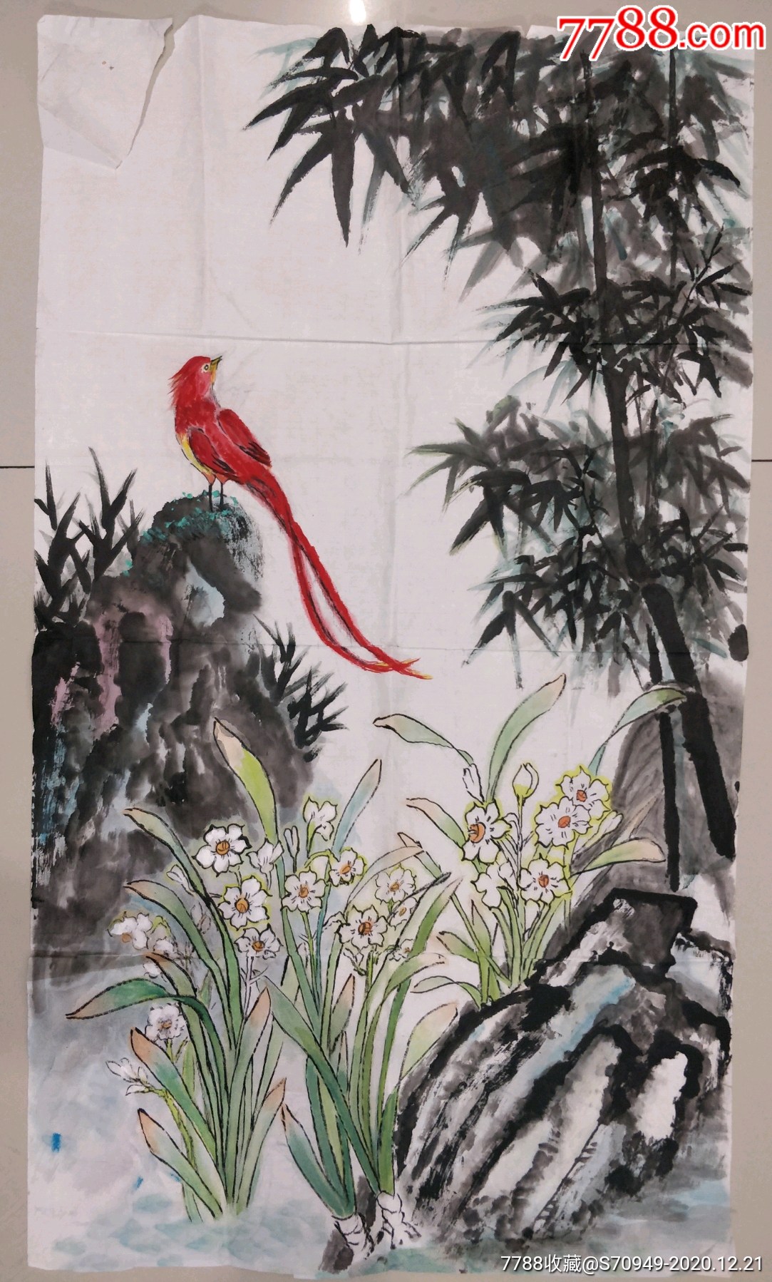 水仙寿带鸟_花鸟国画原作_镜泉草堂【7788收藏__收藏热线】