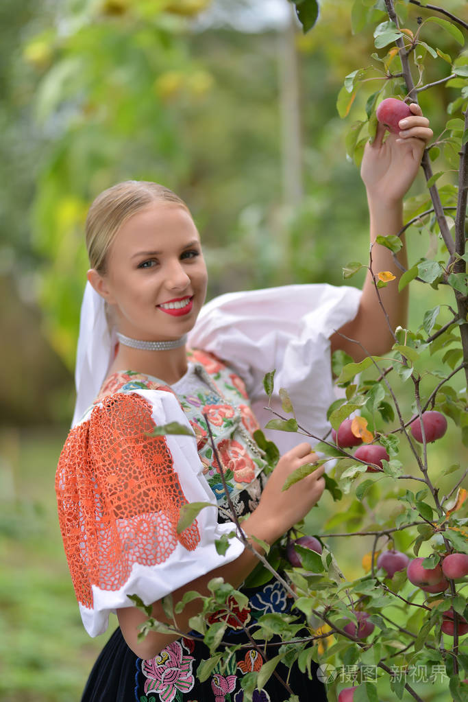 在果园里摘苹果的女人