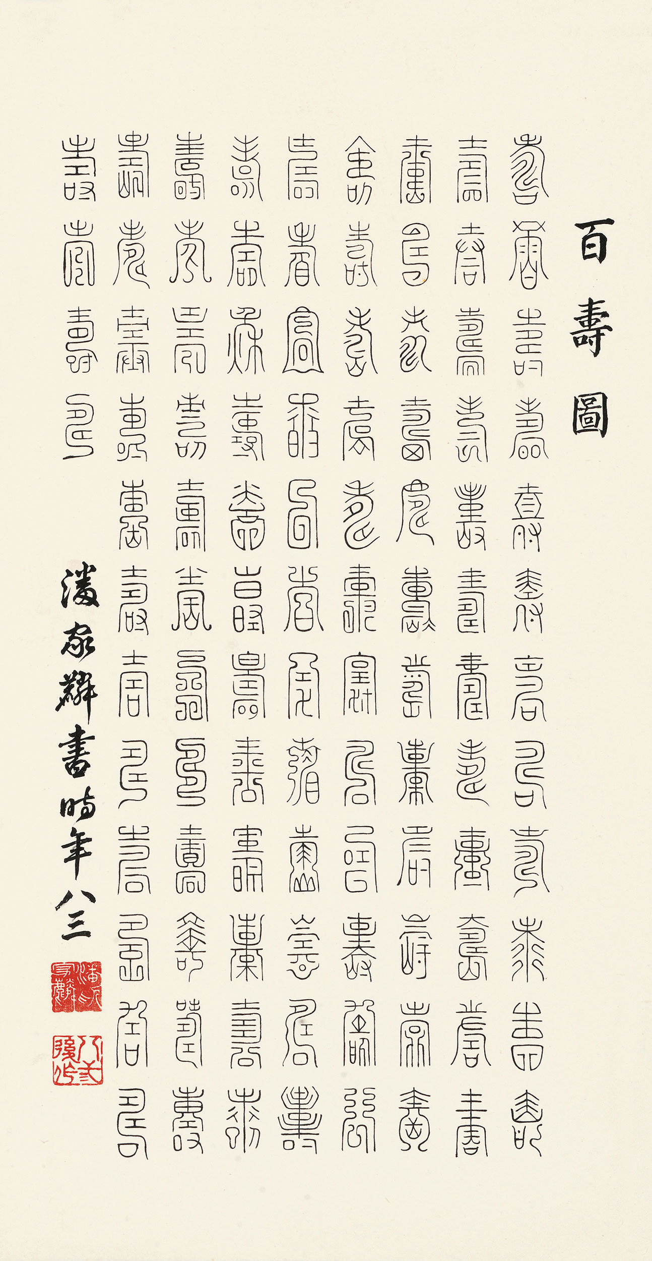 保安百寿图笔意而作,原图字样久异,真草棣篆皆全,有如形象文字,为