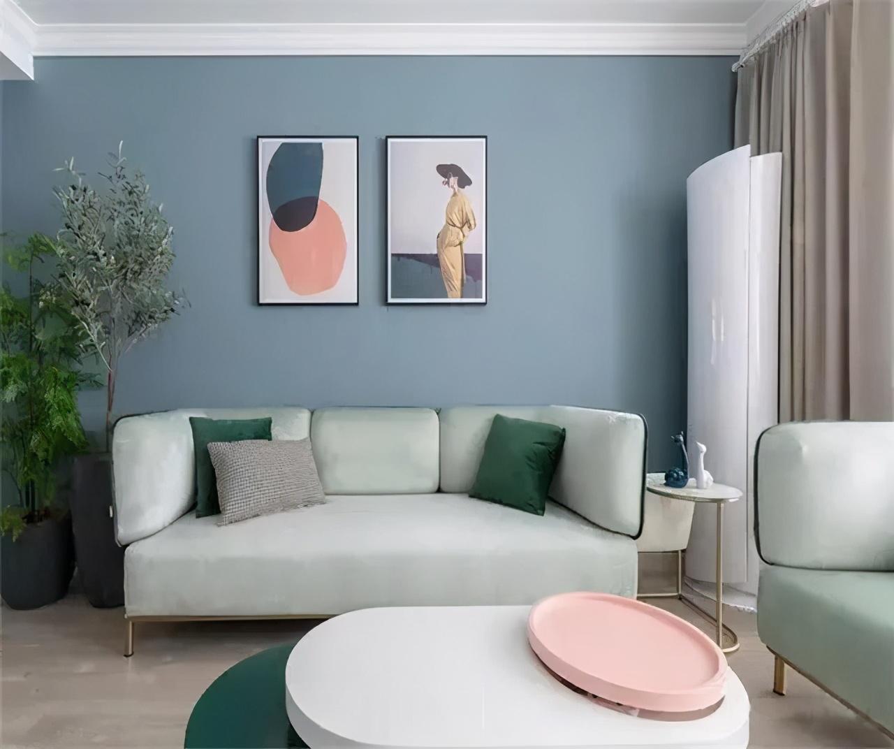 女业主喜欢蓝色 沙发背景墙便空出一面做了饱和度低的雾霾蓝色