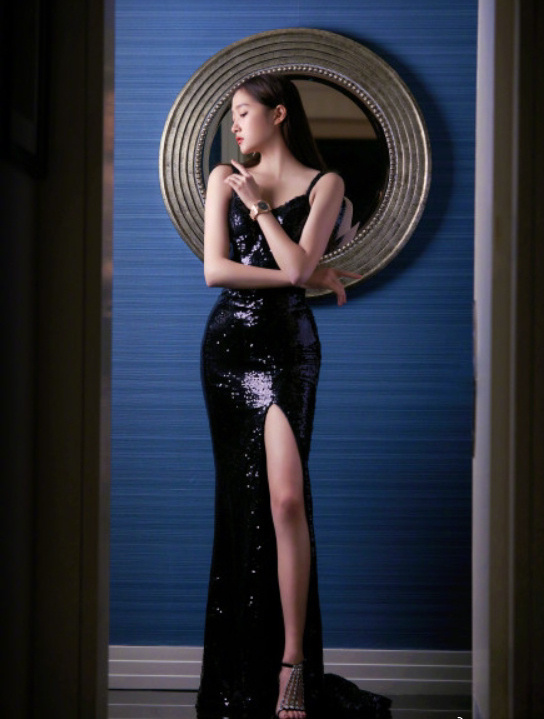 关晓彤 身穿黑色抹胸短裙性感优雅, 皮肤白皙光泽双腿修长